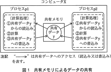 複数のプロセスが,共有するデータ(以下,共有データという)を書き換える処理を,並行して実行する場合がある。このようにプロセス間でデータを共有する方法の一つとして,プロセス間で共有するメモリ(以下,共有メモリという)に共有データを格納する方法がある。ここでは,CPUが一つで共有メモリをもつコンピュータ X 上で,二つのプロセスp1,p2が 共有メモリを使用して並行に処理を実行する場合を考える。