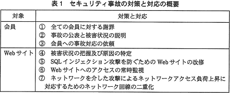 Z氏は,一般的なWebサイトにおけるセキュリティ事故に関して考えられる対策と対応を調査し,今回のセキュリティ事故において会員とWebサイトに対して必要と思われる対策と対応を表1にまとめて,Y部長に報告した。
