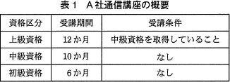 A社では資格を取得するための通信講座を提供している。資格には上級,中級,初級の3種類があり,各講座の修了判定で合格すると合格証が発行され,資格取得となる。上級資格向けの講座を受講するには,中級資格を取得している必要がある。A社通信講座の概要を表1に示す。