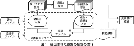 - 毎月初めに,前月で受講期間が終了した受講者を対象に,答案の提出回数と平均点を算出し,修了判定処理を行う。平均点は,全ての答案の合計点を受講期間の月数で除算して求める。答案が未提出の場合,及び提出期限を過ぎて答案が到着した場合は,提出回数に含めず,点数は0点とする。