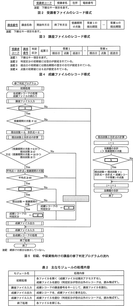 受講者ファイル,講座ファイル,成績ファイルのレコード様式を,図2~4に示す。各ファイルは,全て索引順編成ファイルである。初級,中級資格向けの講座の修了判定プログラムの流れを図5に,主なモジュールの処理内容を表2に示す。