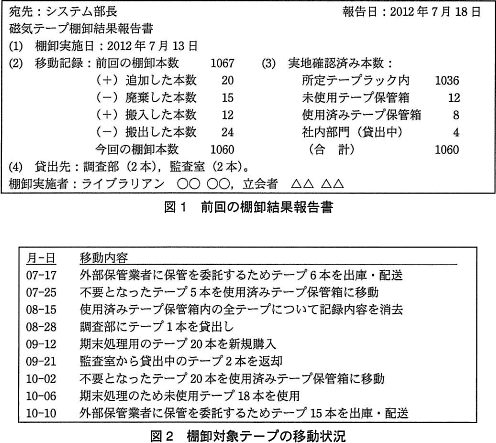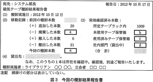 図1,図2を基に,今回の棚卸しを実施した。現場でテープの有無を確認した結果,調査部に貸し出した,機密情報を記録したテープ1本の所在が不明であった。それ以外のテープは,全て台帳どおりに実在していることが確認できた。これらの事業を基に,今回の棚卸結果報告書を図3のようにまとめた。