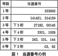 - くじの当たりは1~6等の6等級から成り,図1に示すように各等級には一つ以上の当選番号がある。各等級での当選番号の桁数と個数は異なる。