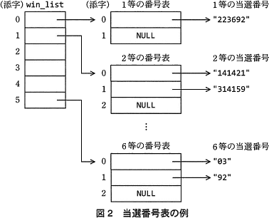 - 当選番号表 win_list の要素 win_list[i] には,i+1等の番号表へのポインタが格納されている。win_list[i] が指す i+1等の番号表の要素 win_list[i][j] には,当選番号の数字列へのポインタが格納されている。最後の要素 win_list[i][Ni](Niは,i+1等の当選番号の個数)には,図2に示すように空ポインタ定数が格納されている。