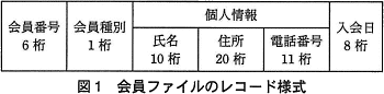 - 会員ファイルは,図1に示すレコード様式の索引ファイルであり,会員番号を 主レコードキーとする。呼出し法は順呼出しとする。