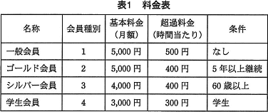 - 会員種別には,表1に示す会員種別が格納される。利用料金は,会員種別によって決まる。