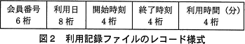 - 利用記録ファイルは,図2に示すレコード様式の順ファイルであり,1か月分の会員の利用実績を格納する。1レコードには,1人の会員の1回の利用に関する情報が格納される。