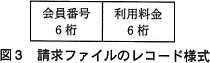 - 請求ファイルは,図3に示すレコード様式の順ファイルであり,会員ごとの月次請求金額を格納する。超過料金は1か月の利用時間の合計(分)を時間単位に切り上げて課金する。