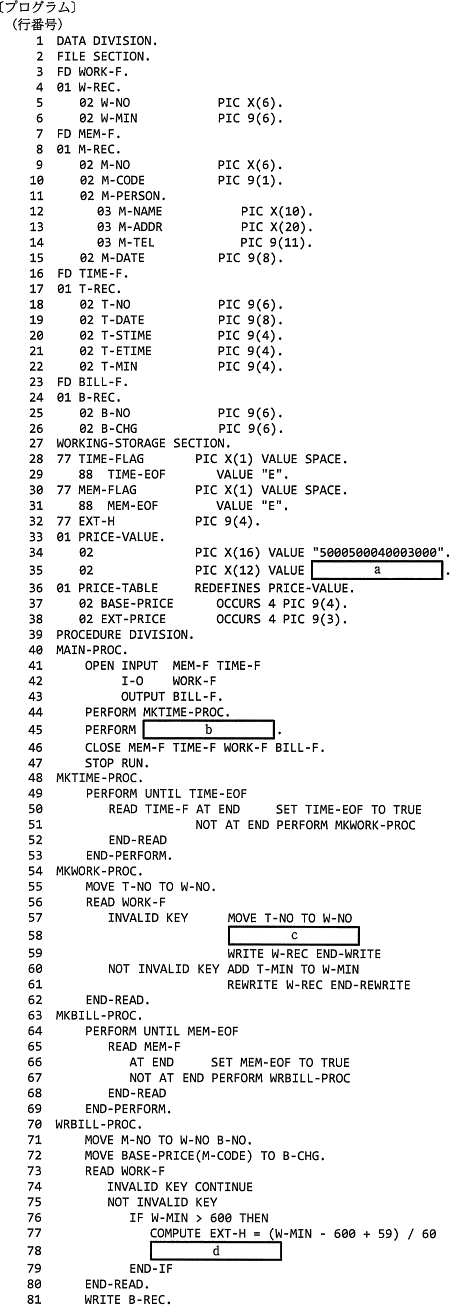次のCOBOLプログラムの説明及びプログラムを読んで,設問1,2に答えよ。
