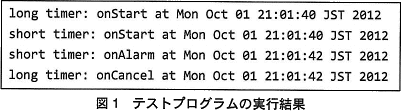 このテストを実行したところ,図1の結果が得られた。プログラムの実行速度は十分に速いものとし,各メソッドの処理時間は秒単位の時刻の測定に影響がないものとする。