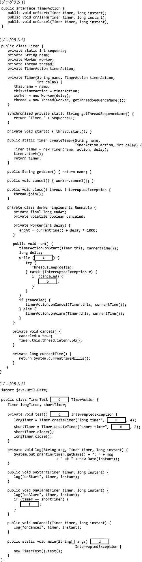 スレッドを利用してタイマ処理を行うプログラムである。タイマ処理の基本機能は,秒単位で指定した時間(以下,遅延時間という)が経過したときに,インタフェースで指定したメソッドを呼び出すことである。次のクラス及びインタフェースから成る。