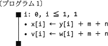 擬似言語の形式で記述したプログラムの一部(以下,プログラム1という)に対して,表1の最適化の方法を複数組み合わせて最適化した例を,表2に示す。