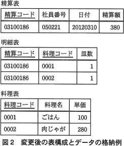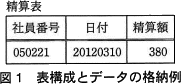 A社のシステム部門では,精算データを記録するデータベースとして,当初,図1に示す表を設計した。
