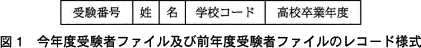 - 今年度と前年度の受験者データは,それぞれ今年度受験者ファイルと前年度受験者ファイルの二つの順ファイルに保存されている。これらのレコード様式を図1に示す。