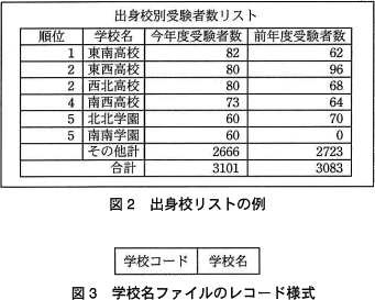 - 図2に示す例のように,出身校リストの印字項目は,順位,学校名,今年度受験者数,前年度受験者数である。印字の順序は,今年度受験者数の降順とし,今年度受験者数が同数の場合は,前年度受験者数の降順,それも同数の場合は,学校コードの昇順とする。