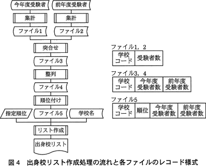 図4に,出身校リスト作成処理の流れと各ファイルのレコード様式を示す。