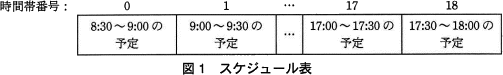 - S社では,各社員の予定を30分単位の時間帯ごとに図1に示すスケジュール表で管理している。
