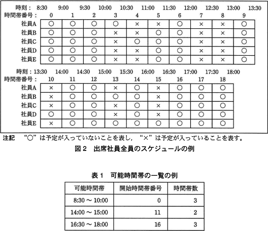 - 候補時間帯 free には,出席社員全員の予定が入っていない,会議時間以上の連続する時間帯(以下,可能時間帯という)を全て格納する。最後に格納した要素の次の要素の開始時間帯番号には,-1を格納する。例えば,出席社員5名(社員A~E)の予定が図2のとおりであった場合,会議時間が1時間(slot_num=2)のとき,可能時間帯の一覧は表1になる。