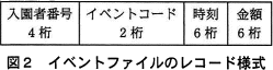 - イベントファイルは,図2に示すレコード様式の順ファイルである。入園者のICカード利用状況(以下,イベントという)を格納する。ファイルは,営業日ごとに作成する。