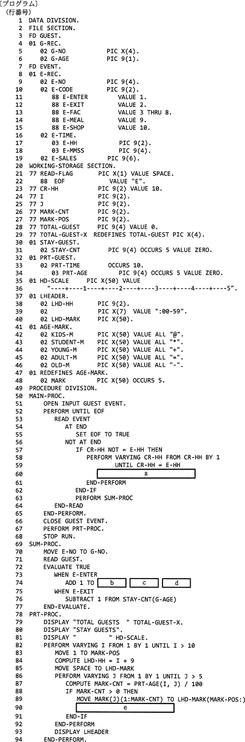 次のCOBOLプログラムの説明及びプログラムを読んで,設問1,2に答えよ。