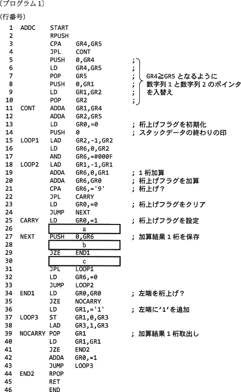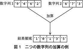 主プログラムから渡された二つの数字列(数字列1と数字列2)をそれぞれ正の10進数とみなして加算し,結果を数字列で返す副プログラム ADDC である。二つの数字列の加算の例を図1に示す。
