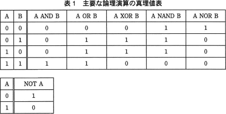 真を1,偽を0として,主要な論理演算の真理値表を,表1に示す。