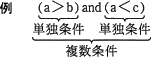 分岐の判定条件には,一つの条件だけを評価する単独条件と,二つ以上の単独条件を and 又は or で組み合わせて評価する複数条件がある。単独条件と複数条件の例を次に示す。