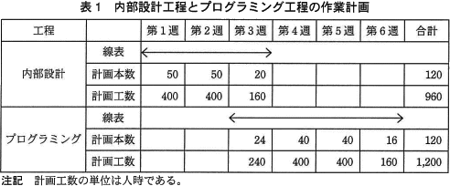 - 外部設計工程の終了時に見積もった内部設計工程とプログラミング工程の作業計画を表1に示す。表中の計画本数及び計画工数は,各週で作成するプログラムの本数及び作成に掛かる作業の工数の計画値である。
