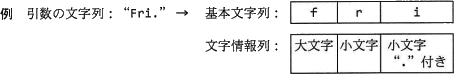 - 各引数の文字列から,基本文字列と文字情報列を生成する。基本文字列とは,引数の文字列から英字だけを順に取り出して,大文字を小文字に変換した文字列である。文字情報列とは,基本文字列中の各文字に対応する6種類の文字情報(大文字,小文字,大文字"-"付き,小文字"-"付き,大文字"."付き,小文字"."付き)を表す情報の列である。ここで,"-"及び"."は,直前の英字に属する文字情報とみなす。