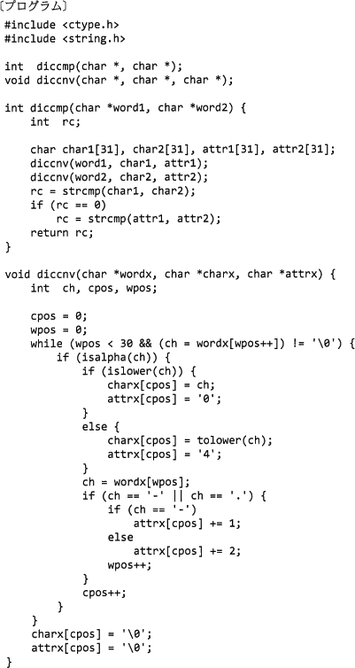 関数 diccmp は,英大文字,英小文字,"-"及び"."を含む二つの英単語の大小を辞書順で比較する。
