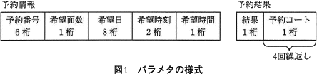 - 予約コートには,予約できたコートのコート番号を設定する。例えば 3 番コートを予約できた場合は 3000 を設定し,1 番コートと 2 番コートを予約できた場合は 1200 を設定する。予約ができなかった場合は,0000 を設定する。