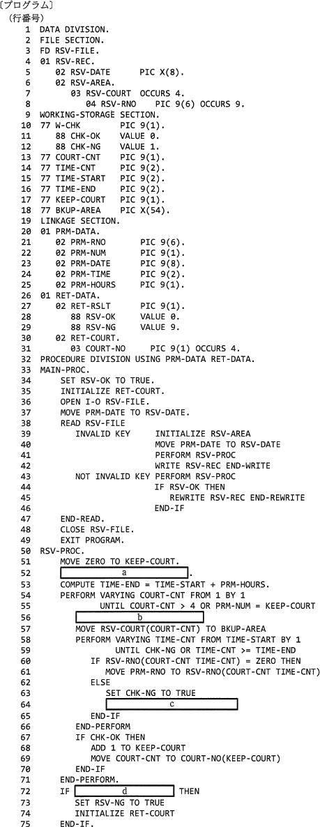 次のCOBOLプログラムの説明及びプログラムを読んで,設問1,2に答えよ。
