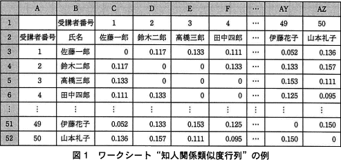 任意の2学生の知人関係の情報を表現した"知人関係類似度行列"を作成した。ワークシート"知人関係類似度行列"の例を図1に示す。