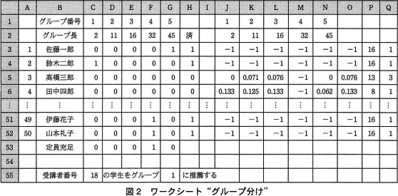 ある科目を受講する学生を,知人関係の情報に基づいてグループ分けするプログラムを表計算ソフトで作成した。グループ分けする対象の学生は50人である。グループはそれぞれ10人で,各グループにはあらかじめ1人のグループ長が決められている。