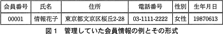 管理していた会員情報の例とその形式は,図1のとおりである。