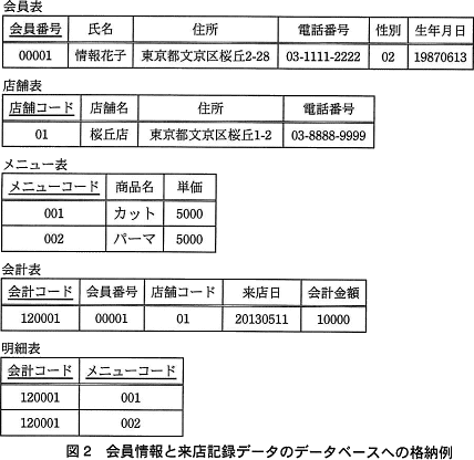 まず,会員情報と来店記録を管理するために図2に示すデータベースを設計した。下線付きの項目は主キーを表す。