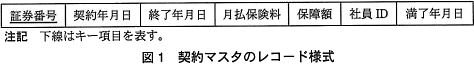保険契約の情報は,10桁の数字列から成る証券番号の昇順に並んだ契約マスタファイル(以下,契約マスタという)で管理する。証券番号は,保険契約1件につき一意に付与する。契約マスタのレコード様式は,図1のとおりである。