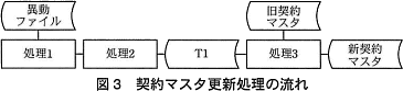毎日,異動ファイル中の前日発生分のレコードと前日の契約マスタ(以下,旧契約 マスタという)から,更新した契約マスタ(以下,新契約マスタという)を作成する。契約マスタ更新処理の流れを,図3に示す。