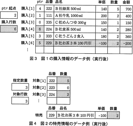 この方法では,特売のレコードを購入[]に書き込むとき,既に購入[]中にその特売のレコードが存在していることがある。また,値引きが成立していた特売のレコード中の数量が 0 になったとき,その特売のレコードの削除が必要になることがある。