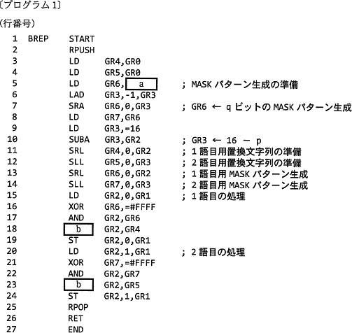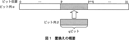 連続する2語から成るビット列αについて,左端のビット位置を0としたとき,ビット位置pから始まるqビットを,別のビット列βで置き換える副プログラム BREP である。ここで,0≦p<16,1≦q≦16とする。置換えの概要を図1に示す。