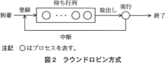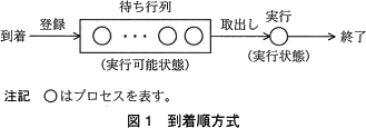 プロセスを到着順に待ち行列の末尾に登録する。実行中のプロセスが終了すると 待ち行列の先頭からプロセスを一つ取り出してCPUを割り当て,実行を開始する。到着順方式を図1に示す。待ち行列に登録されているプロセスの状態を実行可能状態,実行中のプロセスの状態を実行状態と呼ぶ。
