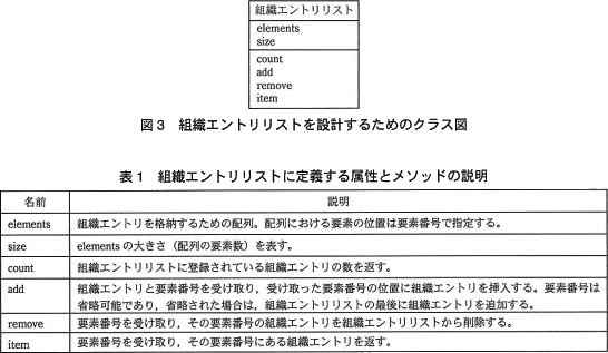 この組織エントリリストを設計するためのクラス図を図3に,組織エントリリストに定義する属性と操作の説明を表1に示す。以下,操作をメソッドという。
