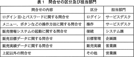 S社では,販売情報システムを更新する(以下,システム更新という)とともに,自社のサービスデスクを利用して販売情報システムに関する社員からの問合せに対応する。サービスデスクは,社員からの問合せの内容を表1に示す区分に従って分類し,ログインと操作に関する問合せについては自ら回答する。ログインと操作以外の問合せについては,受付日時などの記録を行い,担当部門に引き継ぐ。引継ぎを受けた担当部門は問い合わせた社員に回答するとともに,回答の内容や回答を完了した日時をサービスデスクに報告する。