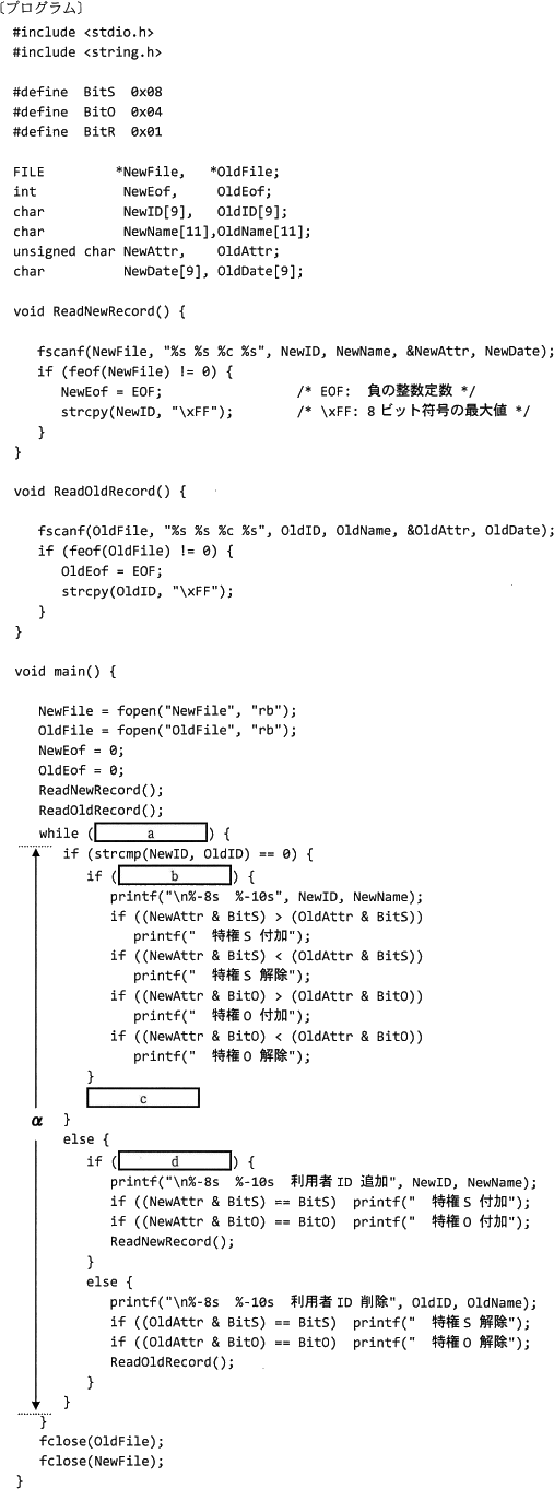 strcmp関数の結果が0ということは2つの利用者IDが一致しているということです。このとき行う処理は〔プログラムの説明〕(3)③の「NewFile 及び OldFile の両方にあり,特権Sと特権Oの少なくとも一方の付加状況が変わった利用者IDの場合」処理になります。if文で真となるときに印字処理を行っているので、条件式[b]には「特権Sと特権Oの少なくとも一方の付加状況が変わった」ことを判定するための式が入ります。