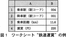 - ワークシート"鉄道運賃"に乗車駅の駅コード(セルB1)と降車駅の駅コード(セルB2)を入力すると,乗車距離(セルB3)と運賃(セルB4)が表示される。乗車駅と降車駅の駅コードは,鉄道路線の各駅に割り付けられた駅コードのリストから選択して入力するようになっている。ワークシート"鉄道運賃"の例を図1に示す。