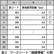 - 駅コードと隣接駅間距離は,起点駅から終点駅に向かってワークシート"路線情報"の列Aと列Bに順に格納されている。ワークシート"路線情報"の例を図2に示す。