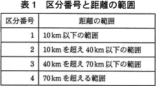 - 各区分には1~4の番号(以下,区分番号という)が割り付けられている。各区分の距離の範囲は表1のとおりである。