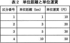 - 区分ごとに,運賃計算の基準となる単位距離が決められている。区分,単位距離と単位運賃の関係を表2に示す。区分距離の端数は単位距離に切り上げ,単位距離ごとに単位運賃を加算する。