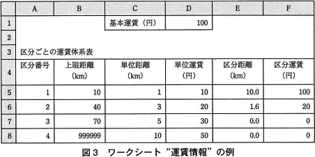 - 基本運賃と各区分の区分番号,距離の範囲の上限(以下,上限距離という),単位距離及び単位運賃を格納したワークシート"運賃情報"の例を図3に示す。