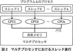 プログラムを並列に実行する方法として,スレッドを使用した並列実行がある。スレッドを使用した並列実行では,プログラムの中で並列実行が可能な部分を抽出して複数の処理に分割し,分割した処理を別々のスレッドとして同時に実行する。